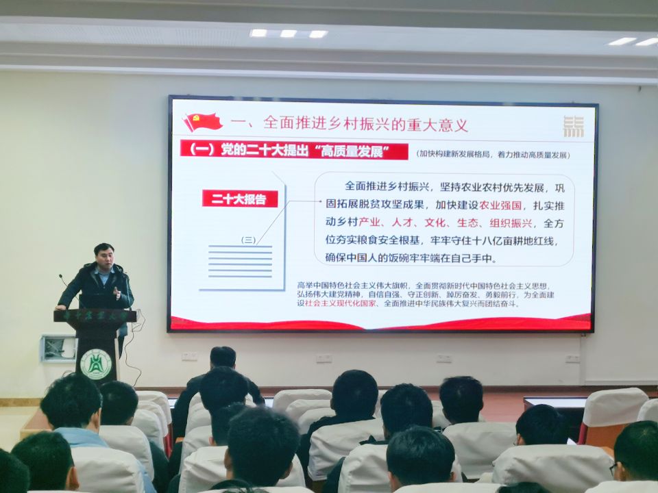 2月27日,学校 “精读精讲”宣讲团成员、辅导员卜祥利以“全面推进乡村振兴的战略意义和实践路径”为题,向同学们讲解了乡村振兴战略的提出背景、已取得的成就、重大意义和实践路径;他结合自己的支教经历和习近平总书记给“本禹志愿服务队”回信精神分享了学校在全面推进乡村振兴中所做的工作和贡献;“与祖国同行,为人民奉献”,他用回信精神鼓励同学们用脚步丈量大地、用知识哺育乡村、用青春报效国家!农业生物质增值化技术与装备研究生第二党支部党员姜儒娇在学习后谈到,乡村振兴离不开人才的振兴,我们应从理论学习中拓宽视野,在实践锻炼中增长才干,认真学习专业知识,争取成为助力乡村振兴的有用人才。