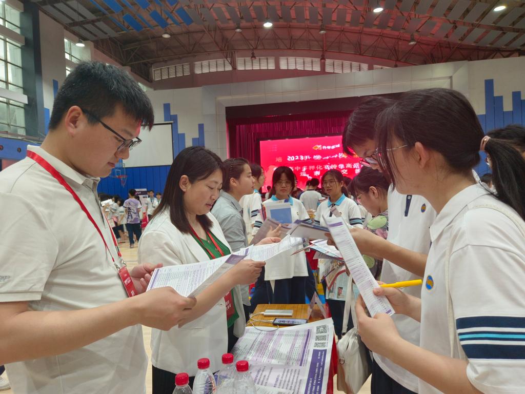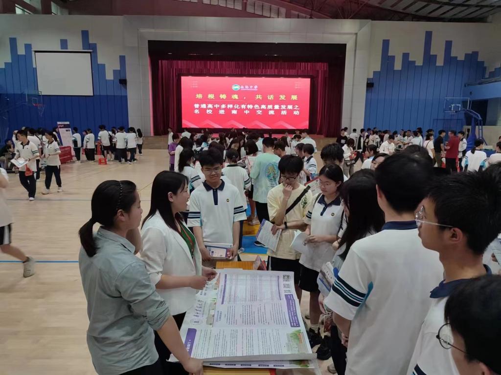 在惠州一中和南海中学咨询现场,咨询点位被热情的高中生们紧紧围绕,他们拿着招生简章,纷纷提出了自己的问题,“多少分可以上华中农大呀?”“咱们学校的王牌专业是啥呀?”“未来的就业前景好不好?”现场的老师们为他们一一解答,并鼓励他们刻苦学习,表达了希望能够相遇狮山的美好愿景。