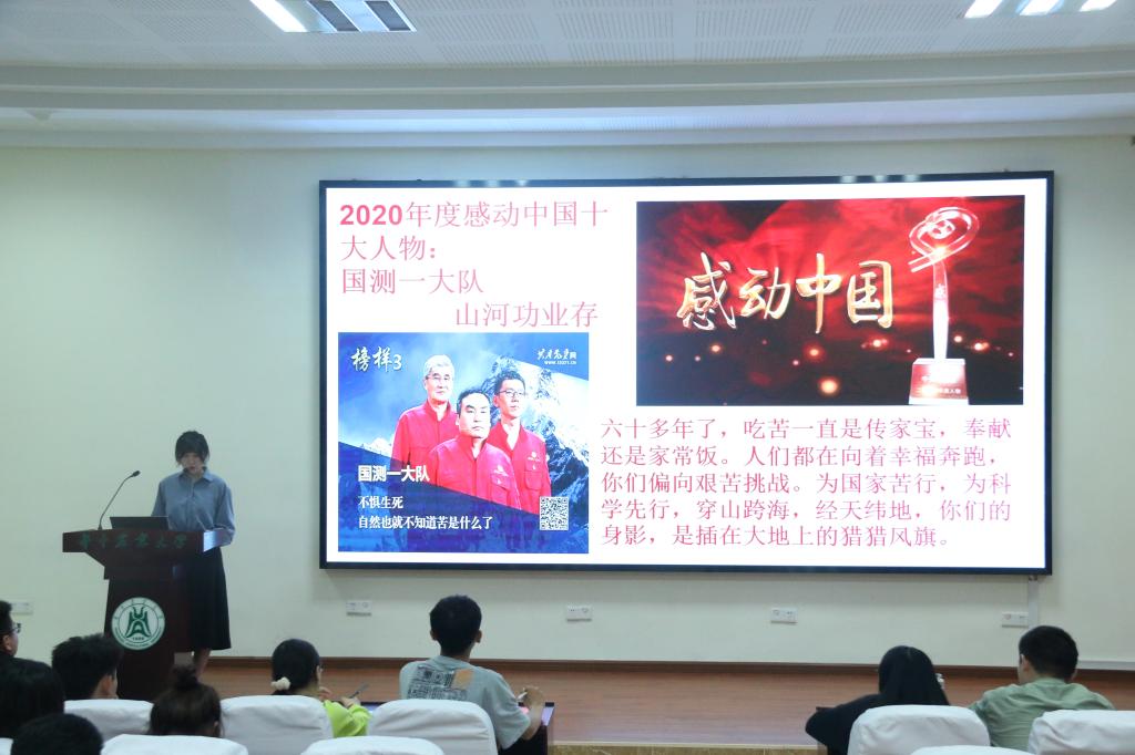 2020级农业工程专业研究生于重洋、康启新、鄢钱团队通过王尔琢的一封家书,向我们展示了革命者舍己为公的家国情怀。2020级研究生刘风顺讲述了抗日英雄杨靖宇舍生忘死争取民族独立的英雄事迹。2020级机械专业研究生宋扬向我们讲述了国测一大队突破外国封锁将测量觇标矗立于祖国各地的故事,她讲到这种为国家苦行,为科学先行的精神始终激励青年学子不断前行。2020级农业工程专业的研究生郑志明团队从西藏民族改革历程中谈中国共产党为人民谋幸福、为民族谋复兴的初心和使命。